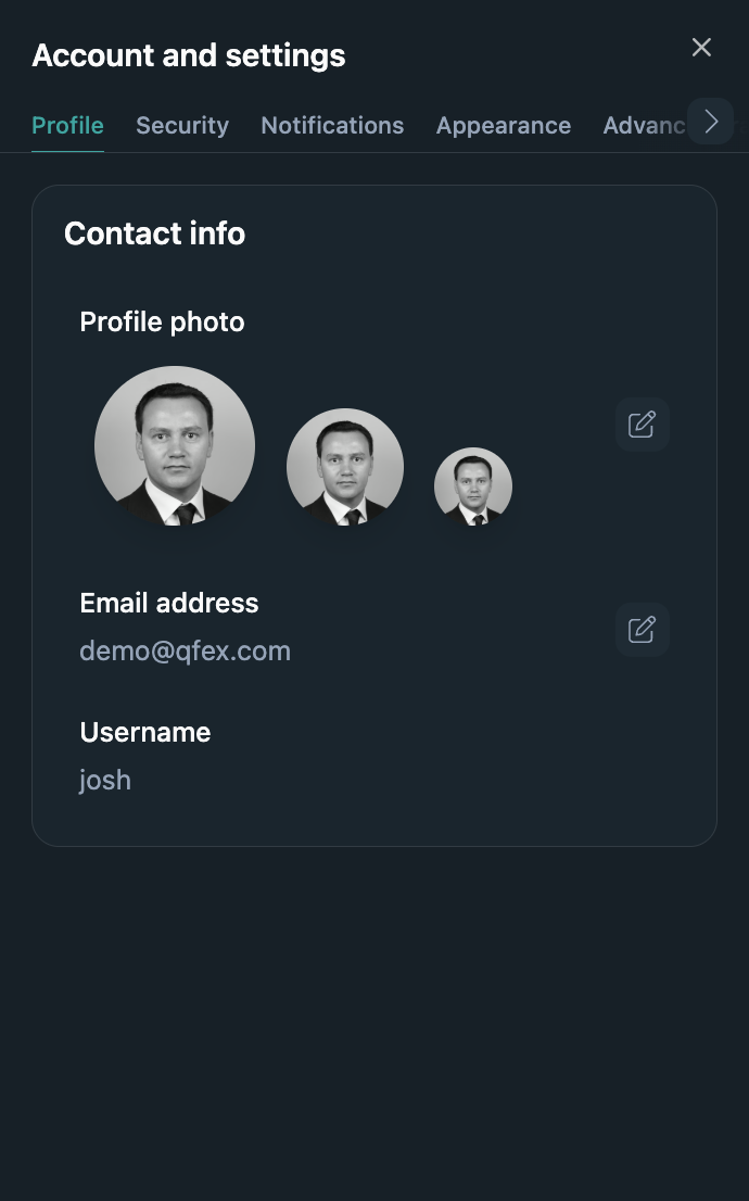Sign in at qfex.com and select your profile in the bottom right corner.