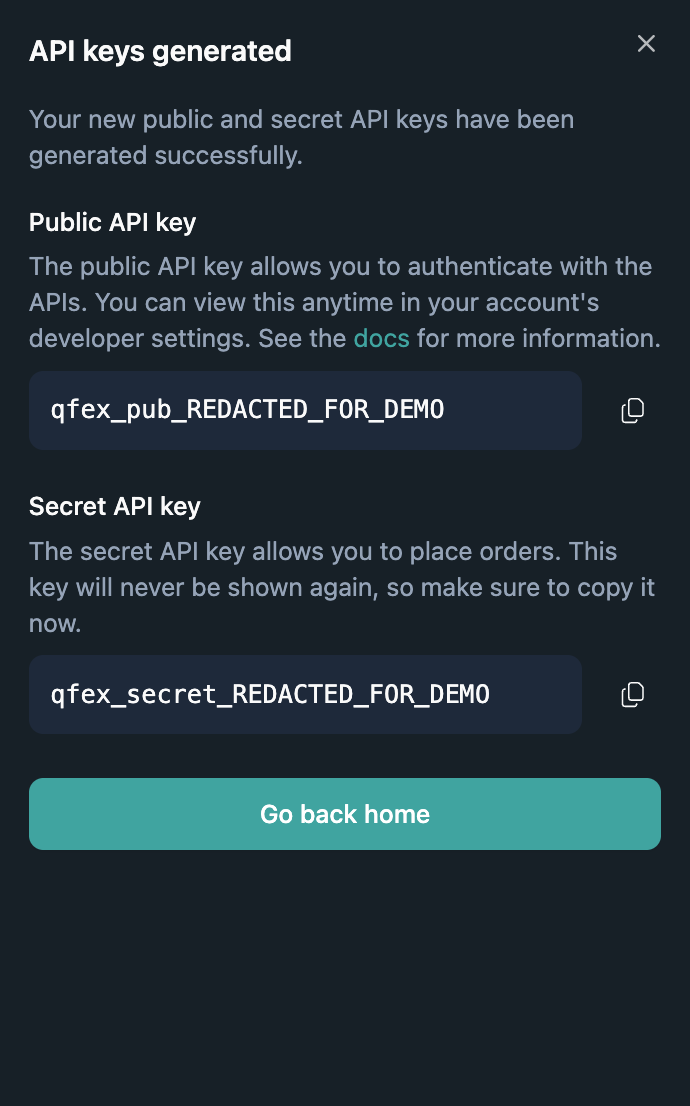 All API calls must be authenticated with an API Key. You can create and manage your keys from your QFEX dashboard:-